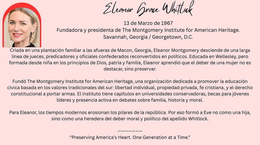 Eve es la encarnación del conservadurismo con manicure perfecto. Voz dulce, frases medidas, una sonrisa que desarma… hasta que afila el cuchillo. Representa lo que muchos idealizan: tradición, compostura y una certeza férrea de que el mundo debe seguir ciertas reglas. Las suyas.